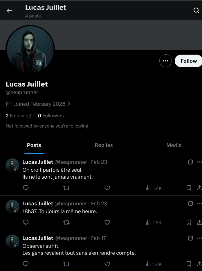 More interestingly, if we check her followers we can find a strange account, @heaprunner, belonging to a user named Lucas Juillet, who says weird things like “We think that we are sometimes alone, but we never really are.”